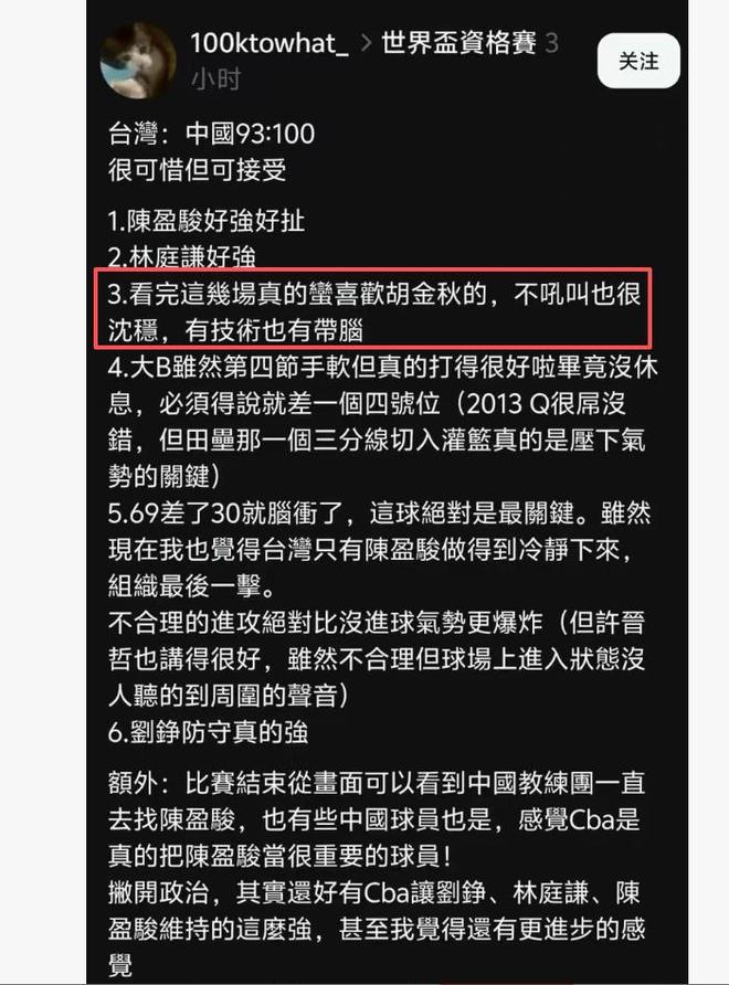 胡金秋的在世预赛的表现值得台北球迷喜爱和赞扬,与日本队的比赛胡金秋砍下全队最高的20分和12个篮板,打爆日本队内线,成为逆转日本队最大的功臣之一。昨晚与台北队的比赛虽然没有上一场炸裂,但也拿到全队第二高的15分和6个篮板,两战共砍35分和18个篮板,成为中国队的得分王和篮板王。 这样的胡金秋,不但获得CBA球迷喜爱,自然也获得台北球迷的喜爱。诸位,你对胡金秋有着怎样的评价?